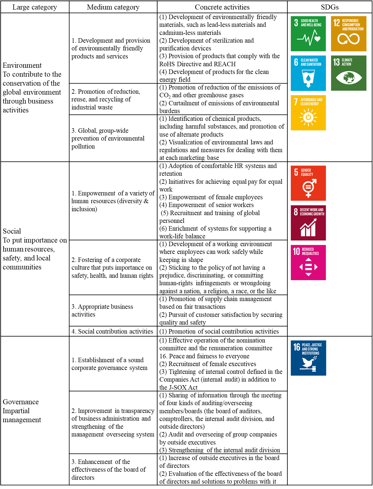In the 4th mid-term management plan, whose initial year is fiscal 2019, “further enhancement of ESG” is one of important themes, and in March 2020, the company visualized the SDGs that are closely related to its important initiatives. The company plans to intensify ongoing initiatives and speed up sustainable business administration, to contribute to the attainment of SDGs.