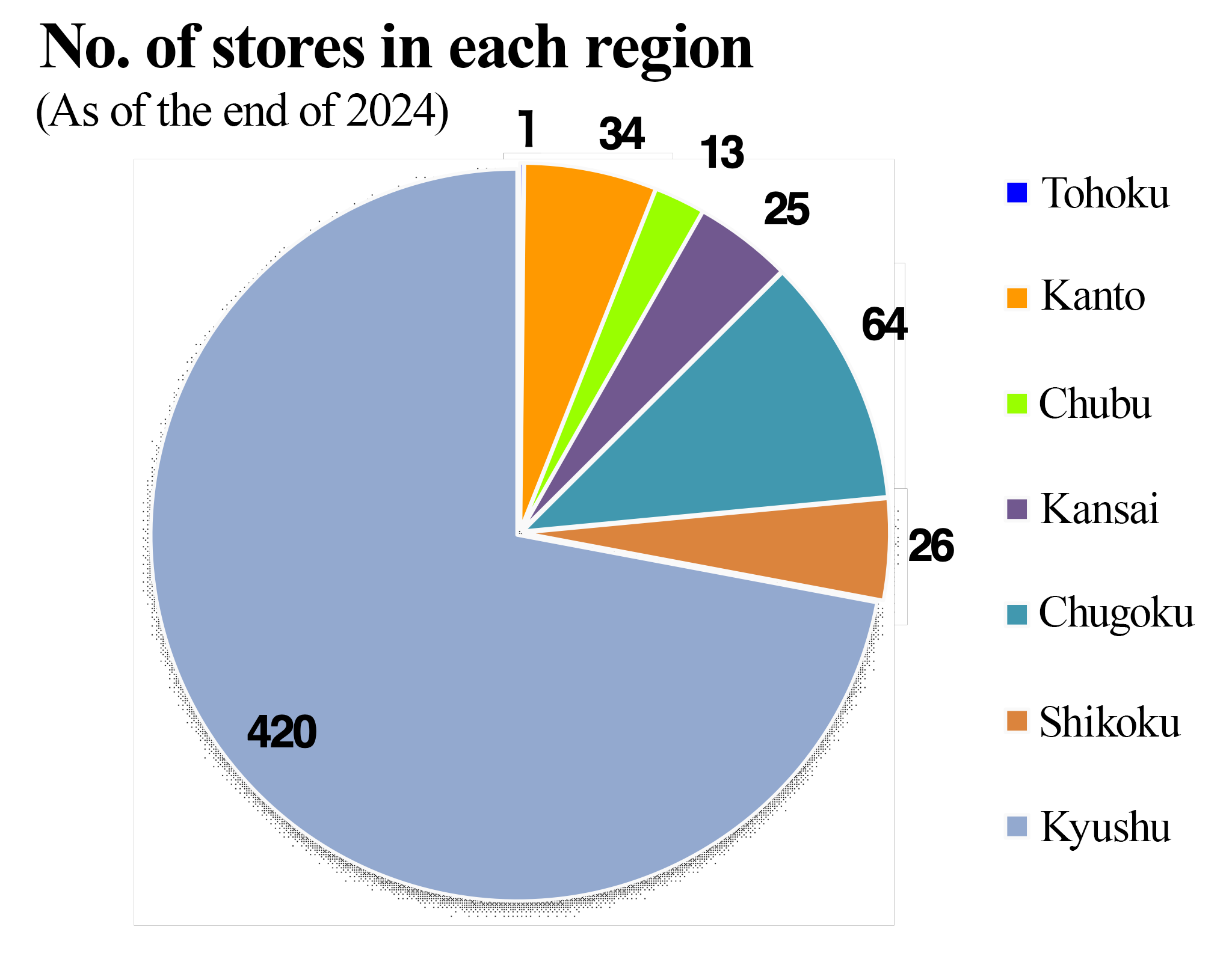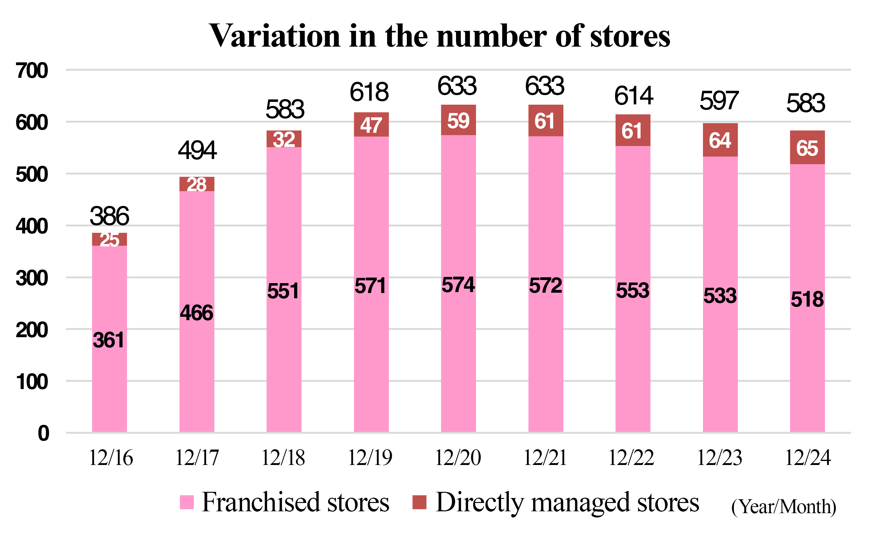 As of December 2024, 583 laundromats (518 franchised ones and 65 directly managed ones) are in operation in Tokyo, Osaka and 25 other prefectures.