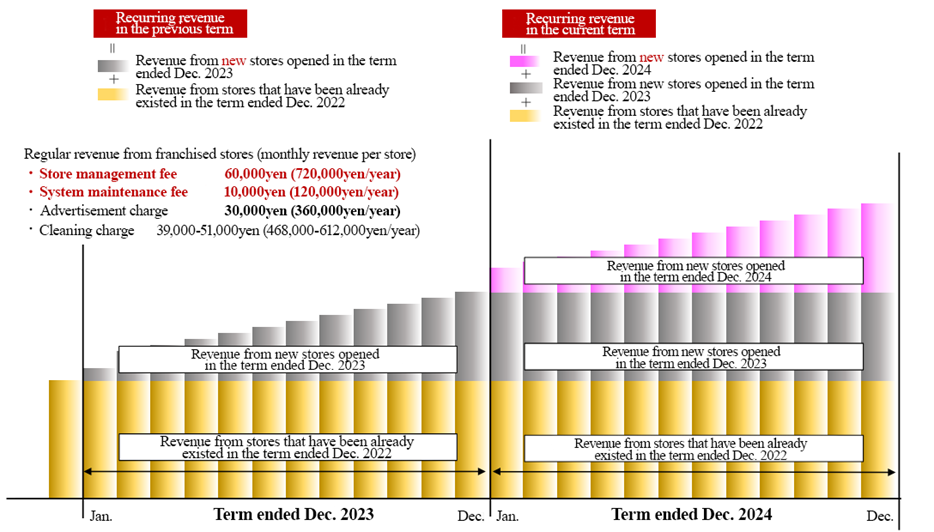 The company has developed an unprecedented franchise chain (FC) business system, which unifies the quality of laundromats by managing and operating all laundromats concurrently, so that both the FC headquarters and franchised shops can thrive. As a great advantage, the company has a stable earning structure with recurring revenue.