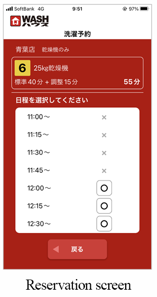 System of the Advertising Service By accepting submissions for ad placements and distributing them through the WASHHOUSE app, the company generates advertising revenue with the goal of eventually offering laundry services for free. | Booking system This resolves the common issue of “bringing laundry only to find no available machines,” and also greatly contributes to reducing in-laundromat congestion.