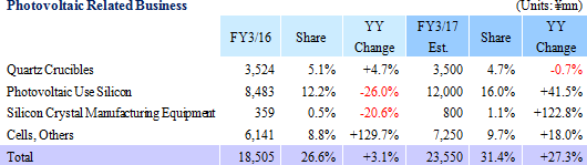 The greater-than-expected sales of equipment related business due in large part to stronger sales of quartz crucibles and thermoelectric modules in the photovoltaic related and electronic device businesses, as well as smaller-than-expected declines in capital investments and capacity utilization rates for miniaturization and three dimensional applications in semiconductor applications towards the end of the year. Profits were profoundly affected by the positive influence of the prolonged weak yen trend and a more-than-expected increase in sales of thermoelectric modules.