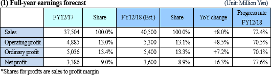 There is no change in the earnings forecast. Sales are projected to increase in all segments and to be 40.5 billion yen, up 8.0% yoy. Operating profit is estimated to rise by 8.5% to 5.3 billion yen.