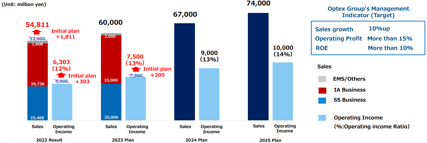 - Under the group's corporate philosophy of "We aim to become a corporate group full of Venture Spirit," the company aspires to achieve an operating profit of 10 billion yen or more and an operating profit margin of 14% in 2025 and has positioned "business model transformation" at the core of its growth strategy. The company is making a shift from conventional single-product sales to solution sales, which includes "expanding the direct marketing strategy" in the SS business, "promoting the challenger strategy" in the IA business (FA segment), and "evolving into a total solution vendor" in the IA business (MVL segment).