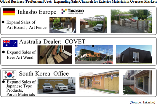 Takasho focuses upon exterior (New construction exterior siding), gardening (Garden lifestyle solutions), and contracting (Non-residential building materials, exterior siding) products. It develops highly unique products based upon the unique concept that "gardens are a paradise that exists in harmony with homes they surround."