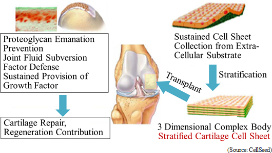 Regenerated cartilage sheet is the result of a joint research project between CellSeed and Professor Masato Sato of the Department of Orthopedic Surgery of Tokai University School of Medicine and is used for indications of cartilage defect and osteoarthritis caused by sports injuries and aging (Both lack in methods for permanent cures currently). This technology enables fundamental regeneration of the cartilage surface through transplant of cell sheets (Three layered regenerated cartilage sheet) made from cultivated cartilage cells. Preliminary consultations have already started and recommendations from the PMDA have been received. At the same time, efforts to accumulate safety data and establish clinical protocols will be prepared through ongoing consultations.Moreover, knee cartilage is called glass cartilage. It is superior in cushioning and abrasion, and is hard cartilage differs from cartilage in ears, nose and other parts of the body. One of characteristics of CellSeed's regenerated cartilage sheets is its ability to regenerate cartilage as glass cartilage. ![]() <Enhance the Regenerative Medicine Support Business, Expand Earnings Opportunities>
