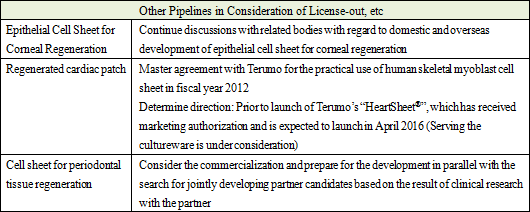 CellSeed has signed a master agreement for the development with the Tokyo Women's Medical University and assumed the research results of the university. As explained earlier in this report, the consultations with the PMDA has completed but clinical trial notification, which had initially been submitted on December 3, 2015, was withdrawn on December 24, 2015 due to some revisions needed. Notification is expected to be resubmitted in April 2016. Moreover, corporate clinical trials are being planned in Sweden and CellSeed Sweden AB was established in May 2015 for the promotion of these trials. Preliminary consultation with the Medical Products Agency in Sweden (MPA) was conducted on November 30, 2015. Currently, CellSeed is promoting preparations for preliminary consultations with the European Medicines Agency (EMA) with a goal of pursuing approval all over in Europe.