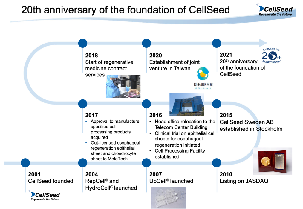 In May 2021, the company celebrated its 20th anniversary. While in the past 20 years, researchers in academia have produced many research results applying cell sheet engineering, in April 2016, CellSeed began clinical trials in Japan for epithelial cell sheets for esophageal regeneration in the cell sheet regenerative medicine business. The development of cartilage cell sheets has also been steadily progressing. In the regenerative medicine supporting business, the company established a Cell Processing Facility (CPC) in 2016 and launched a regenerative medicine consignment service in 2018. The company is aiming to capture more profit opportunities in both businesses in the future.