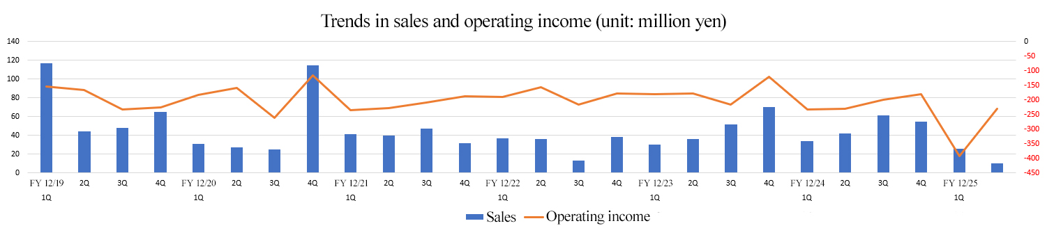 - Sales in the first half of the fiscal year ending December 2025 were 36 million yen, down 39 million yen year on year. Sales on the overseas market were sluggish in the cell cultureware business, which falls under the regenerative medicine supporting business. Operating loss augmented 159 million yen year on year to 623 million yen. SG&A expenses, primarily R&D costs, increased 131 million yen year on year. Interim net income decreased 176 million yen year on year, resulting in a loss of 651 million yen. Having observed signs of impairment of fixed assets, the company posted an impairment loss of 26 million yen as an extraordinary loss. Both sales and profit fell short of the forecast. Sales were affected by the sluggish situation on the overseas market and profit by the fact that part of expenses for launching the third-phase clinical trial for allogeneic cartilage cell sheets in the cell sheet regenerative medicine business, scheduled for the third quarter of the current fiscal year on, arose earlier.