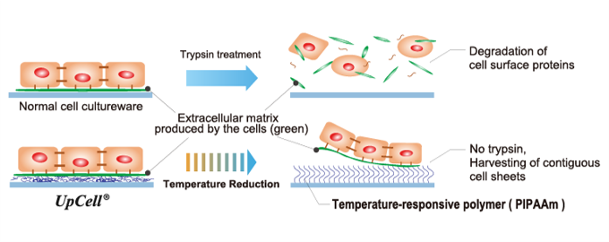 "Cell sheet engineering" is a platform technology originating in Japan and the first of its kind in the world, which was invented by Mr. Teruo Okano, a professor emeritus of Tokyo Women's Medical University. Cells are cultured in “UpCell®,” a cell culture dish whose surface is processed with a temperature-responsive polymer that changes its molecular structure with temperature. The surface of a cell culture dish becomes moderately hydrophobic (water-repellent) at 37 °C, at which cells can attach, and hydrophilic (water-absorbent) at 20 °C, at which cells cannot attach. Therefore, by simply changing temperature, the organically bound "cell sheet" which retains the extracellular matrix (adhesion protein) can be recovered from the culture dish.