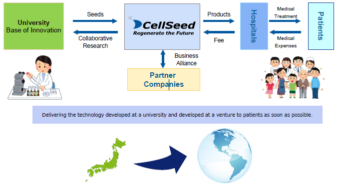 Using the outcomes of research into cell sheets conducted at universities as seeds, the company performs clinical trials, transforms them into regenerative medicine products, and provides products to patients.