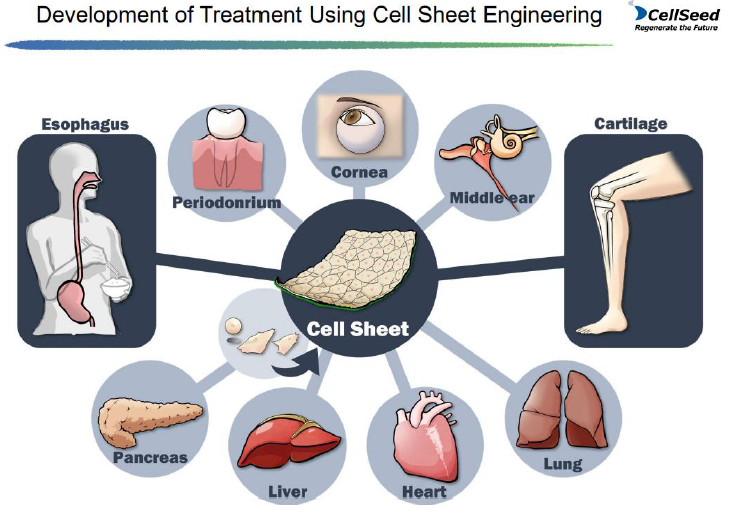 CellSeed uses the fundamental technologies of the world's first “cell sheet engineering” developed in Japan by Professor Teruo Okano of the Tokyo Women’s Medical University in its “cell sheet regenerative medicine” that employs “cell sheets” for the cell regenerative medicine business, and the regenerative medicine support business, where temperature responsive cell cultureware used to fabricate cell sheets are developed and sold and the regenerative medicine supporting business, which support for research and development and commercialization of regenerative medicine, is provided.