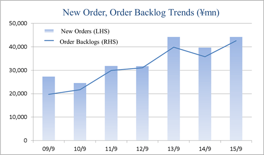 Sales rose by 24.1% year-on-year to ¥43.612 billion on the back of increases in deliveries of custom designed homes and condominiums for sale in the residential properties for sale business segment, increases in deliveries of used residential properties and spec new homes in the housing distribution business segment and higher sales of all business segments. Orders rose by 19.2% year-on-year due to strong orders for custom designed homes and used residential properties. And order backlog, which are a leading indicator for sales, as of the end of September rose by 11.6% year-on-year. Ordinary income rose by 61.5% year-on-year to ¥2.388 billion. While sales of residential properties for sale business and housing distribution business segments rose, sales of contract construction of rental properties declined. Furthermore, increases in expenses related to the effective land utilization business segment, investments in computers and systems, and other ad hoc expenses caused profits of the property leasing and management business segment to decline. And while gross income margin declined by 1.1% point year-on-year due to the decline in highly profitable contract construction of rental properties service, restraint in sales, general and administrative expenses allowed operating income to rise by 62.8% year-on-year to ¥2.440 billion. Moreover, favorable deliveries of residential properties for sale (Custom designed homes and condominiums for sale) and sales of used residential property allowed Fuji to revise its first half sales and profit estimates upwards on July 31.