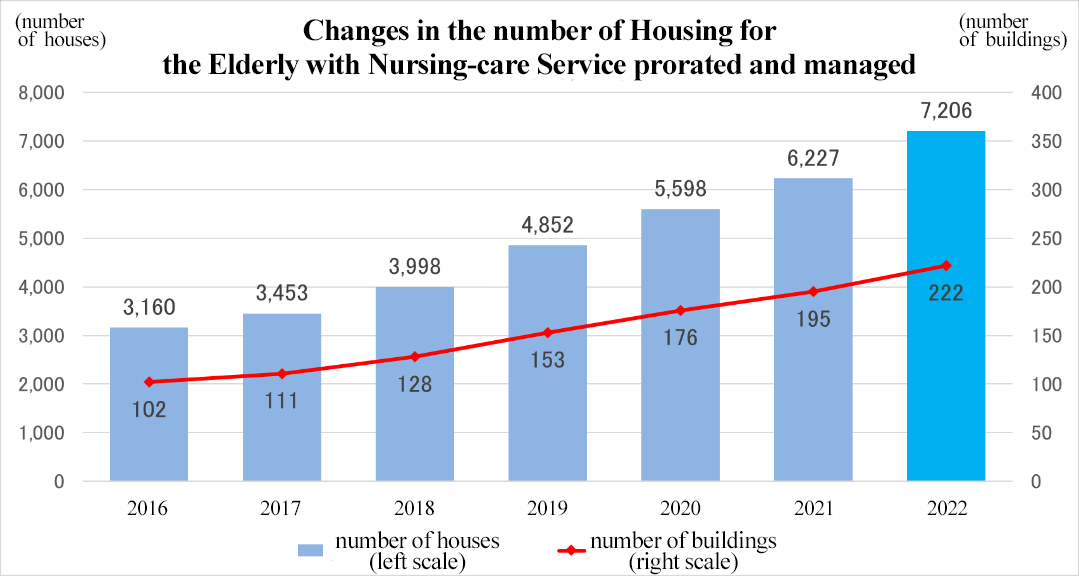 Although the company's sales area is limited to Osaka and parts of Hyogo and Wakayama Prefectures, each of its divisions boasts a national level or the largest market share within its sales area. The company's Residential Housing Division has ranked first in Osaka for six consecutive years in terms of the number of housings starts; the Residential Distribution Division ranks seventh in Japan in terms of the number of used homes purchased and resold; and the Land Use Division ranks fifth in Japan in terms of the number of senior citizen facilities under management, including a whopping 220 serviced residences, making it the No. 1 operator in Japan. “Source: Reform Industry Newspaper, Annual Ranking of Units Sold for Purchase and Resale 2022 (issued on July 25, 2022); the Elderly Housing Newspaper dated August 3 and 10, 2022."