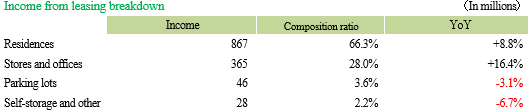 Property leasing revenue was 1,309 million yen (up 9.9% YoY), and segment income was 490 million yen (down 0.8% YoY). The occupancy rate of real estate for residential use exceeded 90%, while the lease of stores and offices remained healthy at a level of slightly less than 90%; however, profit showed a slight decrease due to initial costs, such as placement fees, accompanying the start of lease of real estate for sale. After completion of construction, the company on its own looks for residents for its real estate for sale, and sells such property to local HNWIs and corporate bodies after property leasing revenue becomes stable.