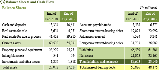 Total assets as of the end of the first half stood at 83,546 million yen, down 4,056 million yen from the end of the previous term. Although the company saw a decrease in condominium units and detached houses, real estate for sale showed growth due to an addition of the real estate for sale which got in full operation in the first half of this term. As for real estate for sale in process, while detached houses and real estate for sale increased, condominium units shrank. Advances received also dropped due to delivery of large-scale property. Equity ratio was 26.5% (24.0% at the end of the previous term).