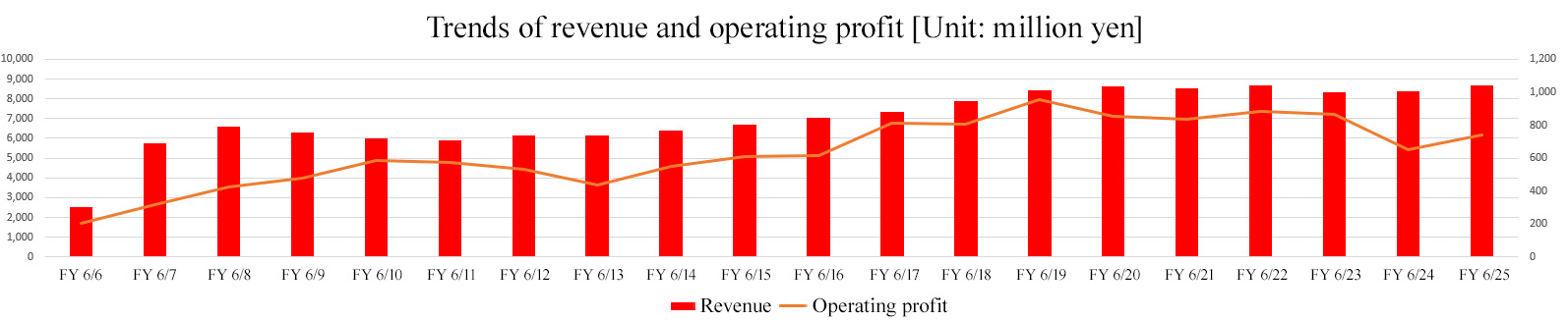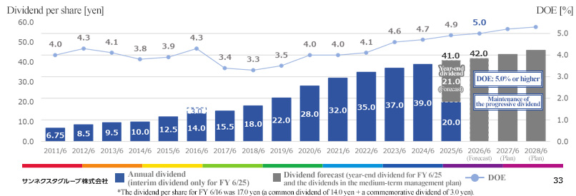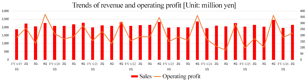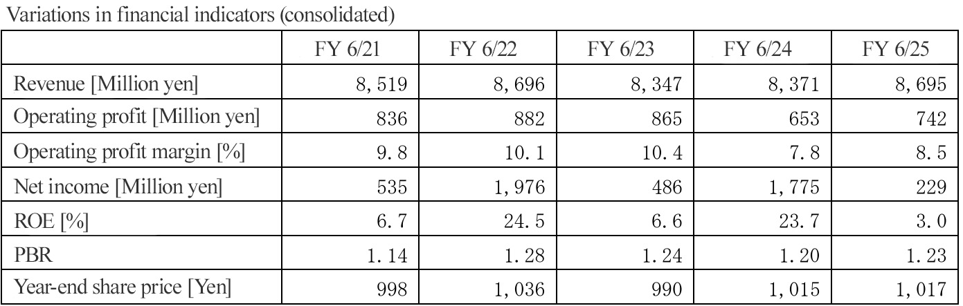 - The earnings forecast remains unchanged. For the fiscal year ending June 2026, revenue is expected to grow 2.3% year on year to 8.9 billion yen. The Corporate Housing Management business and the Condominium Management business are projected to grow steadily. Operating profit is forecast to decrease 5.8% year on year to 700 million yen, as they will see the augmentation of costs for developing systems for business growth and maintaining and stabilizing the quality of operation. The dividend amount is expected to be 42.00 yen/share, up 1.00 yen/share from the previous fiscal year. The company plans to increase dividends, excluding the commemorative dividend, for the 15th consecutive fiscal year. The expected payout ratio is 83.9%.