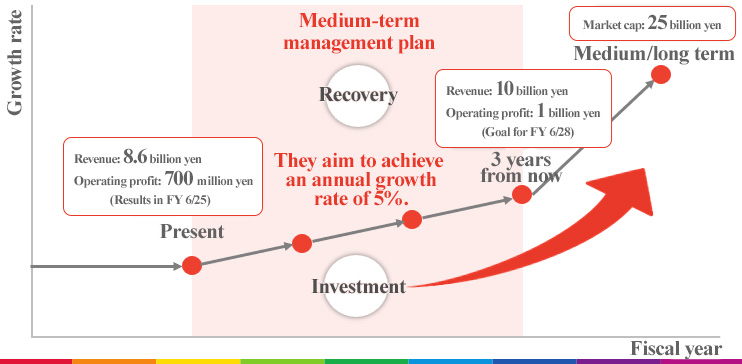 - In a three-year medium-term management plan for the period until the fiscal year ending June 2028, they put importance on the two points: “the recovery toward the recurring revenue growth rate and operating profit margin before the COVID-19 pandemic” and “the redevelopment of the mission-critical system and the investment for creating new businesses, including M&A,” and aim to achieve “a revenue of 10 billion yen and an operating profit of 1 billion yen” in the fiscal year ending June 2028, three years from now. Their medium/long-term goal is to become a corporate group with a market capitalization of 25 billion yen.