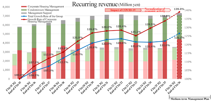 - In the first half of the fiscal year ending June 2026, profit considerably grew despite a decrease in revenue. Revenue declined 1.8% year on year to 4,121 million yen. Although the revenue of the Corporate Housing Management business increased, the revenue of the Condominium Management Business dropped. Recurring revenues were steady. Operating profit rose 48.1% year on year to 405 million yen. While gross profit grew 11.7% year on year, operating profit increased significantly due to a decrease in some expenses, such as system development costs.