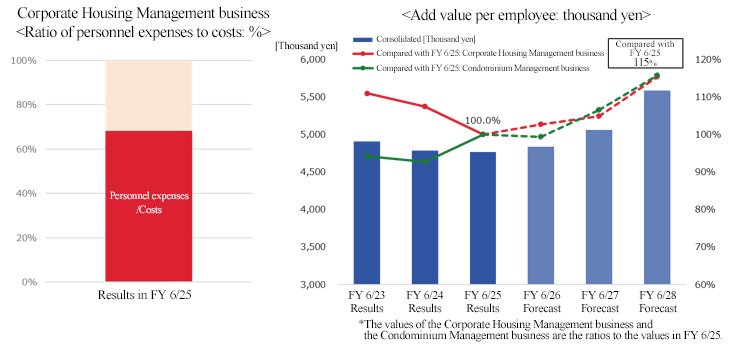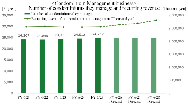 The external environment is becoming harsher year by year. The personnel expenses for superintendents, cleaning staff, and others are augmenting year by year, due to the rise in the minimum wage. In addition, construction costs have increased, so the expenditure of condominium associations is augmenting in an unstoppable manner. The aging of residents progressed, and an increasing number of condominium associations shift to self-management. According to a survey “Variation in the number of condominium units (as of the end of 2024)” conducted by the Ministry of Land, Infrastructure, Transport and Tourism, the total number of condominium units as of the end of 2024 was approx. 7,131,000, indicating that the latent market is significant. Under such environment, they aim to improve profitability rather than increasing the number of condominium units they manage, as described below.