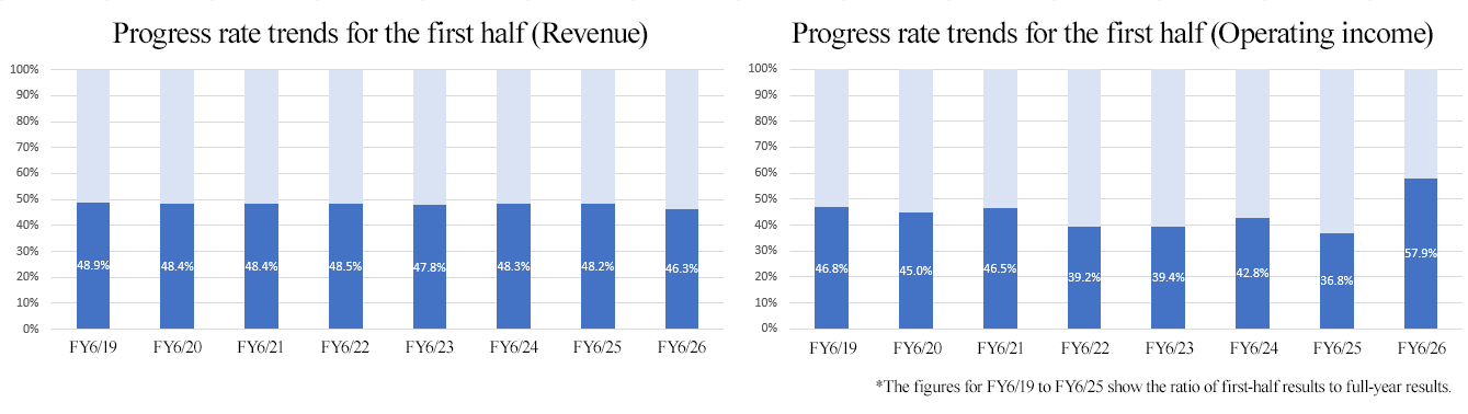 - The progress rate in the first half of the fiscal year reached 46.3% for revenue and 57.9% for profit. While revenue was almost the same as in previous years, operating profit significantly exceeded past results. A temporary shortage of real estate for sale in the Condominium Management business caused a considerable decrease in purchase/resale transactions, which resulted in a decline in revenue and profit, but only to an extent expected at the beginning of the fiscal year. Recurring revenues in the Corporate Housing Management business continue to grow steadily, and we would like to keep an eye on how much the company can build up revenue and profit in the second half of the fiscal year.