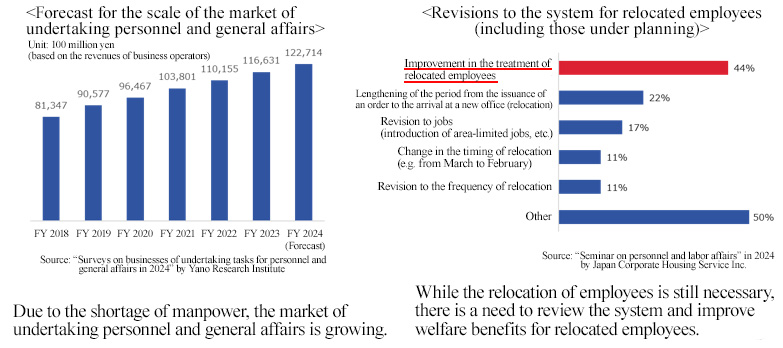 While it is becoming more necessary for enterprises to concentrate human resources and time on their core businesses in order to enhance their competitiveness, the shortage of manpower is becoming serious and workstyles are being reformed, so the market of undertaking personnel and general affairs is growing. In the field of corporate housing, the relocation of employees is still necessary and some enterprises are enriching their housing systems and welfare for improving the satisfaction level of employees so as to recruit and retain personnel. There are no data on surveys on the number of corporate housing units in Japan, but SUNNEXTA GROUP estimates that companies that outsource the management of corporate housing account for around 40% of large companies and 10-20% of small and medium-sized enterprises, and infers that the demand for not only the entrusted management of corporate housing, but also the revision to housing systems, and the change in operation after the revision is strong, so they can receive a healthy number of orders, and growth potential is significant.