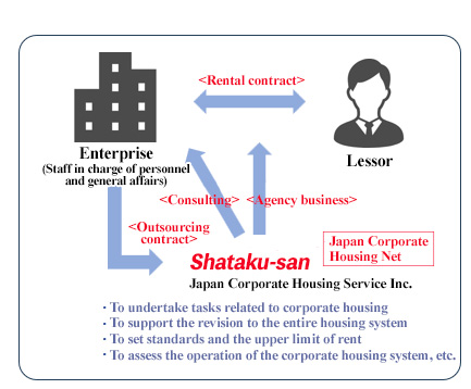 Enterprises need to concentrate on their human resources and time on their core businesses, in order to enhance their competitiveness and improve efficiency. Under these circumstances, the corporate housing management service “Shataku-san” is to undertake all kinds of tasks for managing corporate housing, which are cumbersome and require technical knowledge as mentioned above, from the standpoint of each client company. SUNNEXTA GROUP concludes an outsourcing contract with each client company, and serves an agent for signing a rental contract between each client company and each lessor.