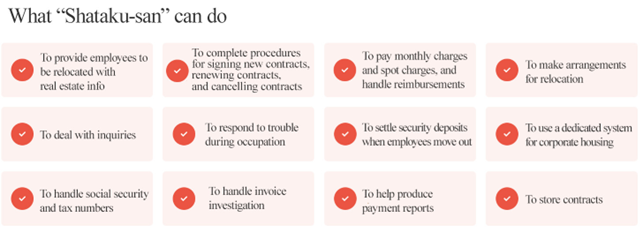 Concrete tasks include the introduction of rentable real estate for corporate housing to client companies, the completion of procedures for signing contracts and moving in, the payment of rents, the arrangements for relocation, the response to trouble during occupation, and the check of expenses for restoration to the original state after moving out.