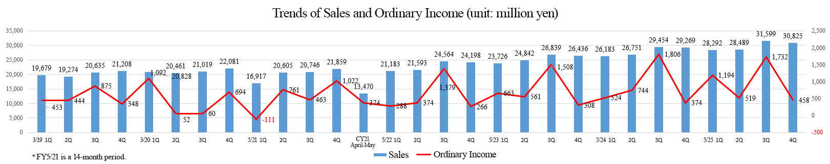 * The fiscal year ended May 2021 is 14 months accounting period. The forecasted values were provided by the company. Unit: million yen. Net income is profit attributable to the owners of the parent. The same applies hereafter.