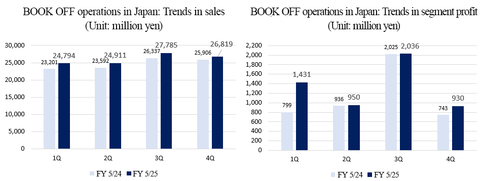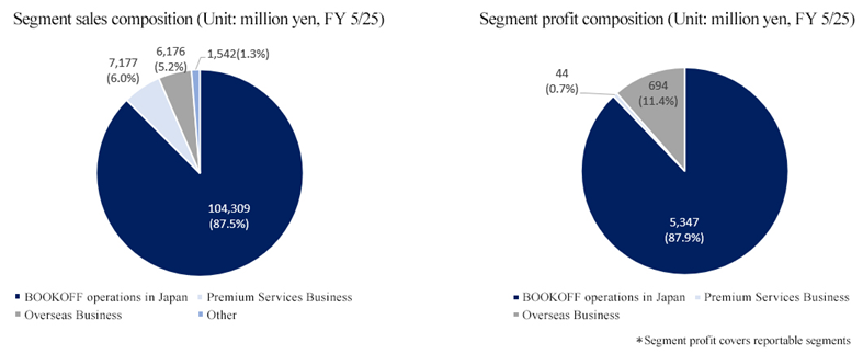 The sales and segment profit of the BOOKOFF operations in Japan in the fiscal year ended May 2025 were about 104.3 billion yen and 5.3 billion yen, respectively, accounting for about 90% of total sales and segment profit. “BOOKOFF” and “BOOKOFF PLUS” accounted for about 50%, and “BOOKOFF SUPER BAZAAR (BSB)” accounted for about 40% of the sales of the BOOKOFF operations in Japan.