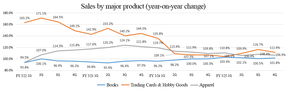 By product category, hobby items, anime, and trading cards are showing significant growth, while books and software media are also steadily increasing.
