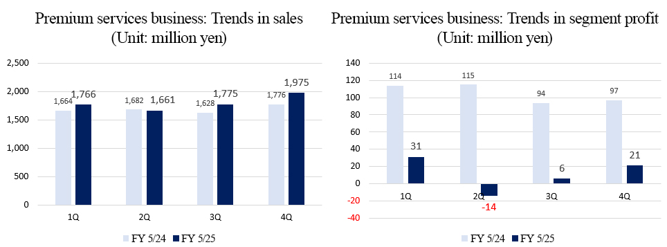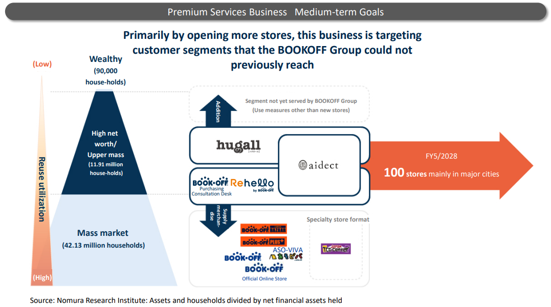 - Consequently, selling space area expanded, the variety and volume of merchandise increased, and sales per tsubo (≒ 3.3 m2) increased significantly, although the total number of stores decreased. In particular, “BOOKOFF SUPER BAZAAR” with an area of around 1,000 tsubo (≒ 3,300 m2), which can handle an overwhelming amount of products and meet a variety of needs, accounts for a significant proportion of profit in this business, so they plan to keep opening this kind of stores actively. On the other hand, regarding the “100-store structure” in the premium service business, they first aimed to realize such a structure in the fiscal year ending May 2028, but seeing the recent progress and business environment, they plan to revise the assumed timing of achieving such a structure, and focus on the strengthening of existing stores. We would like to pay attention to the progress of each business toward the goals in the fiscal year ending May 2028, that is, “sales of 135 billion yen and an ordinary income of 5 billion yen or over.”