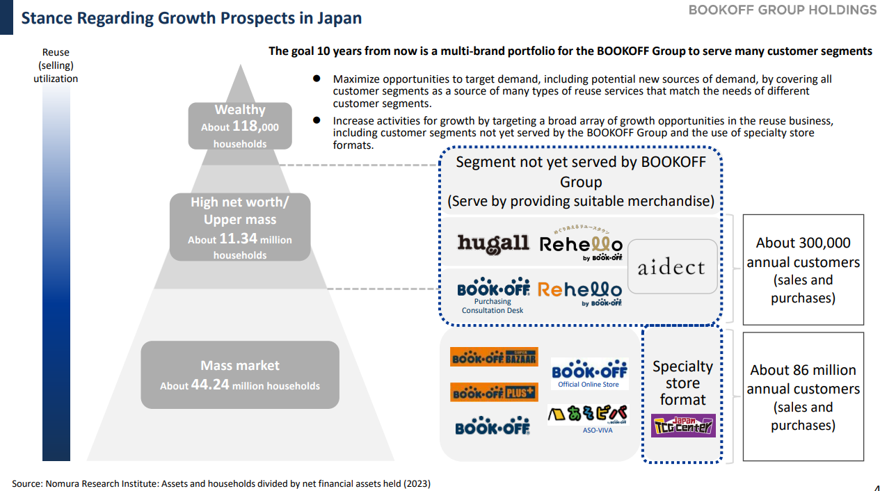 The company operates “hugall” (18 shops), which purchases secondhand products from wealthy people in major department stores, the BOOKOFF Purchasing Consultation Desks (23 stores), which purchases anything, including watches, luxury-brand goods, apparel, tableware, and sporting goods and “aidect” (12 shops) for offering comprehensive jewelry-related services, which buy and sell jewels, receive orders, repair and remake jewels. The total number of stores is 53 as of the end of May 2025.