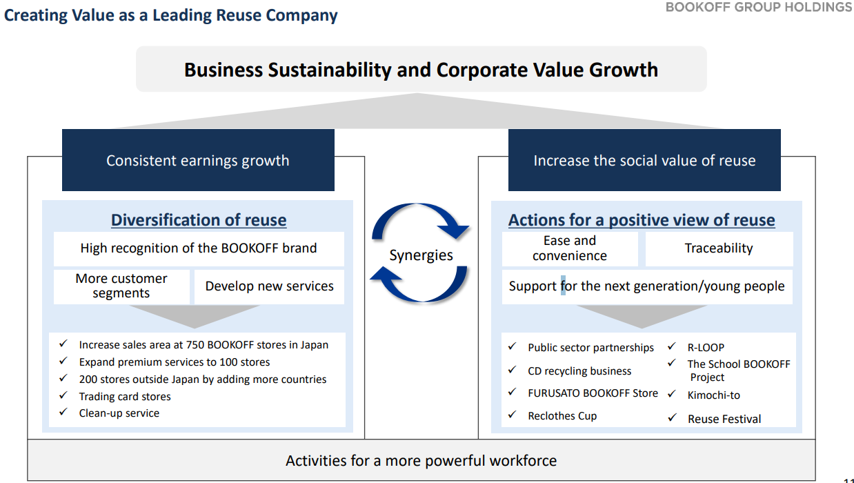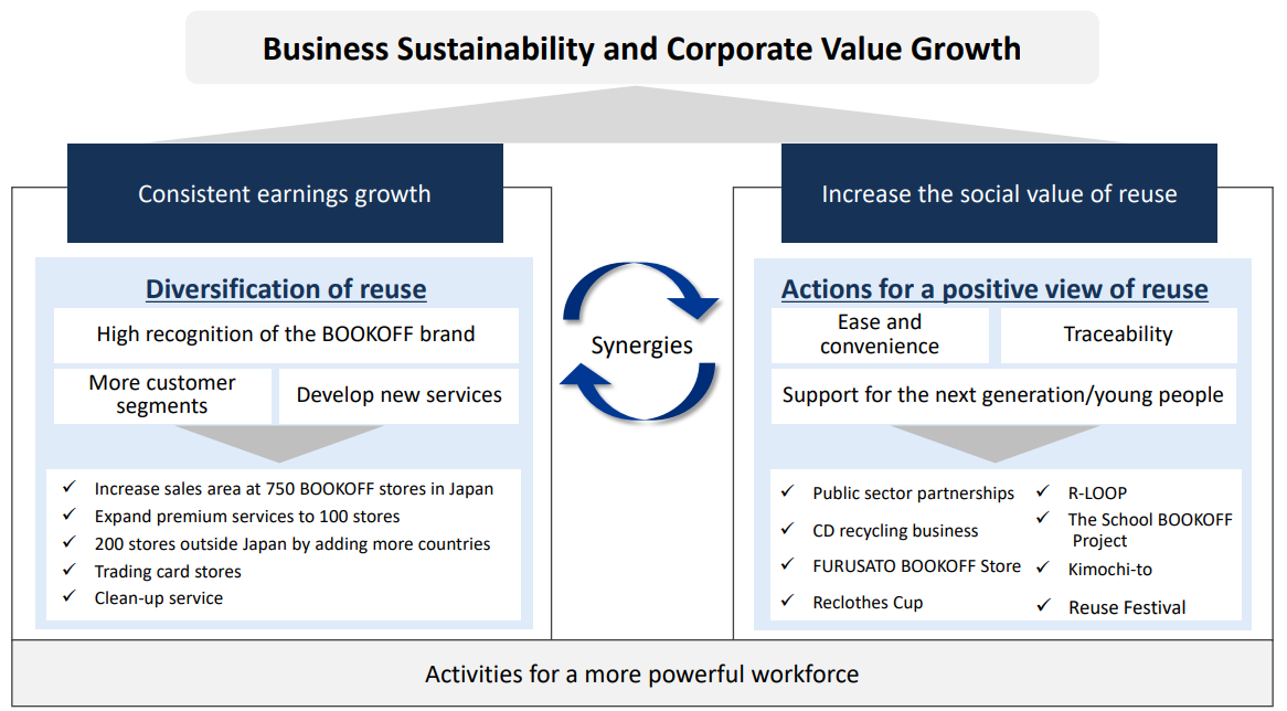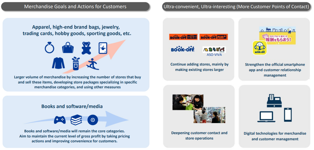 Their three core businesses are the BOOKOFF operations in Japan, the premium services business, and the overseas business. Other businesses include the operation of the trading card shop Japan TCG Center and the provision of a personal service called " BOOKOFF cleanout service" that declutters customers' homes. The company is working on various new business development initiatives to achieve medium-term revenue growth.