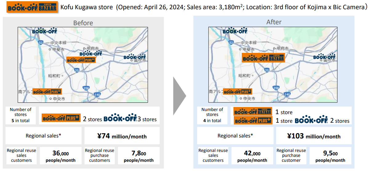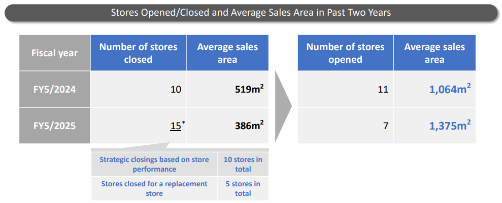 - The number of directly managed stores of the BOOKOFF operations in Japan decreased by 10 from 386 at the beginning of the fiscal year (June 2024) to 376 at the end of the fiscal year (May 2025). In detail, they opened 8 stores, while closing 18 stores, but this does not mean that they have weakened store operation, but they intended to improve the efficiency of store operation by opening large-sized stores while closing small-sized stores. While they conduct the strategic closure of small-sized BOOKOFF stores with a selling space area of less than 100 tsubo (≒ 330 m2), the average selling space area of stores opened in the past 2 years is 300 to 400 tsubo (≒ 990 to 1,320 m2), 2 to 3 times the average selling space area of closed stores.
