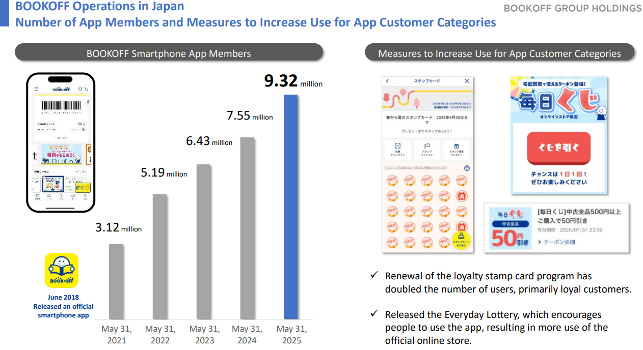 The company is enhancing CRM and enriching its loyalty program to visualize and reward customer engagement with BOOKOFF within the app. The company intends to closely connect with customers' daily lives and encourage them to return to the store and make purchases again.