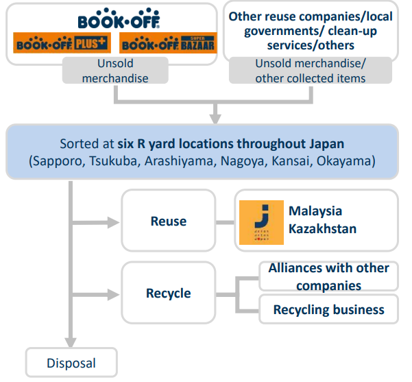 Unwanted items collected not only through the company group's chain stores, but also through partnerships with other companies and local governments, as well as through cleanout business, are sorted at six R-Yards locations throughout Japan based on their condition for reuse, recycling, or disposal, with reusable items shipped to Malaysia and Kazakhstan. The company is also considering expanding R-Yard facilities, primarily in the Kanto region.
