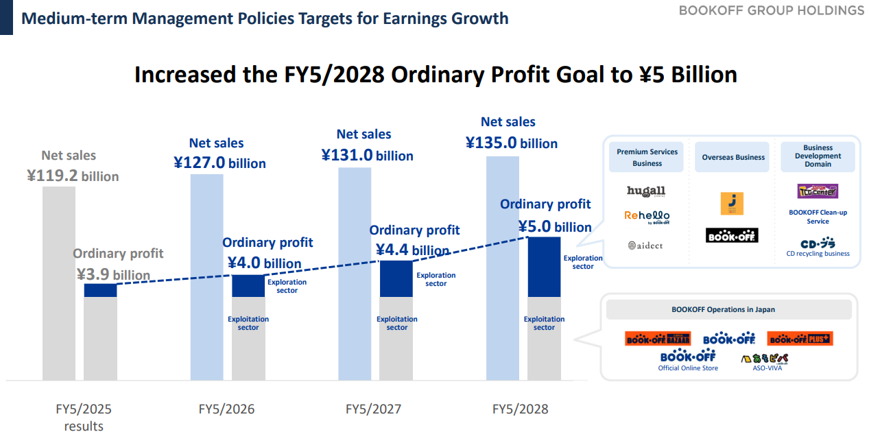 - In the medium-term management policy, they aimed to achieve “sales of 130 billion yen and an ordinary income of 4.5 billion yen or over” in the fiscal year ending May 2028, but seeing the healthy performance of the BOOKOFF operations in Japan, they have upwardly revised the targets to “sales of 135 billion yen and an ordinary income of 5 billion yen.” By securing revenue in the category of Exploitation (the BOOKOFF operations in Japan) and growing profit in the category of Exploration (the premium service business and the overseas business) to raise the profit share in these categories, they aim to break the record-high profit (ordinary income: 3.9 billion yen) marked in the fiscal year ended May 2025, and will improve consolidated profit margin.
