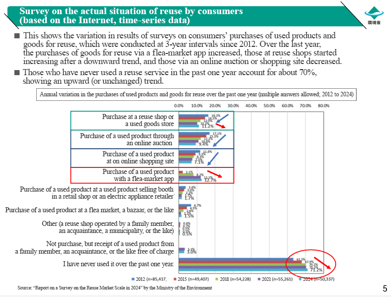 According to the results of the Ministry of the Environment’s survey conducted at 3-year intervals since 2012, the ratio of consumers who have never used a reuse service in the past 1 year is around 70%, showing an upward trend or unchanged performance.