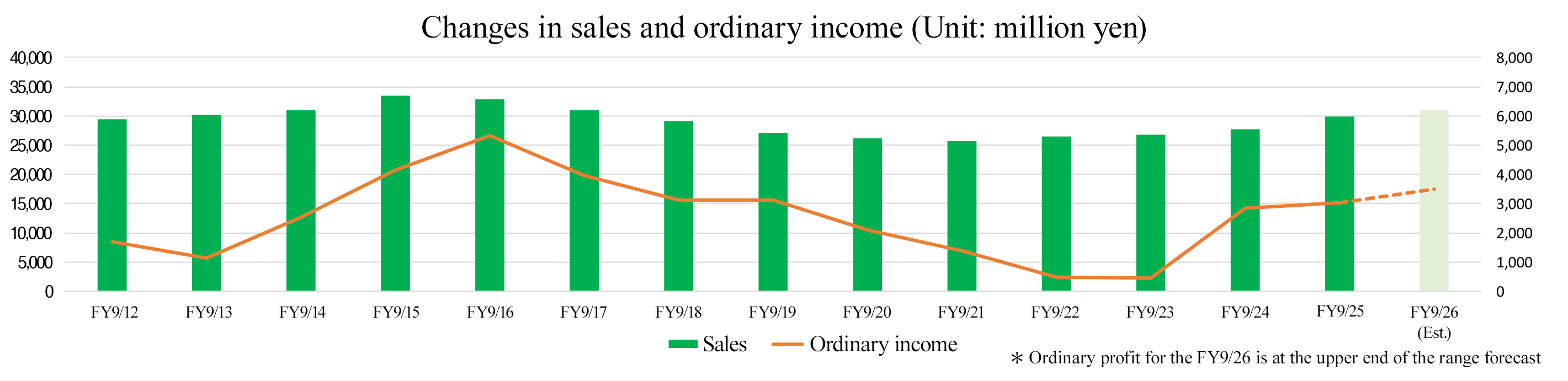 For the fiscal year ending September 2026, the company forecasts sales to increase 3.6% year on year to 31 billion yen, with operating income expected to rise 12.0% to 3.3 billion yen.
