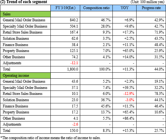 In addition to steady progress in the General Mail Order business, it is anticipated that the company will reach its budget for operating income, thanks to the Specialty Mail Order business, which has been actively increasing new customers and doing away with unprofitable media.