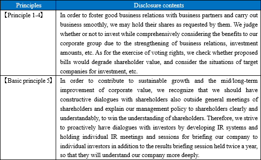 We disclose the compliance with each principle of the corporate governance code under "Our Efforts Towards the Corporate Governance Code" at the following company website (corporate governance).