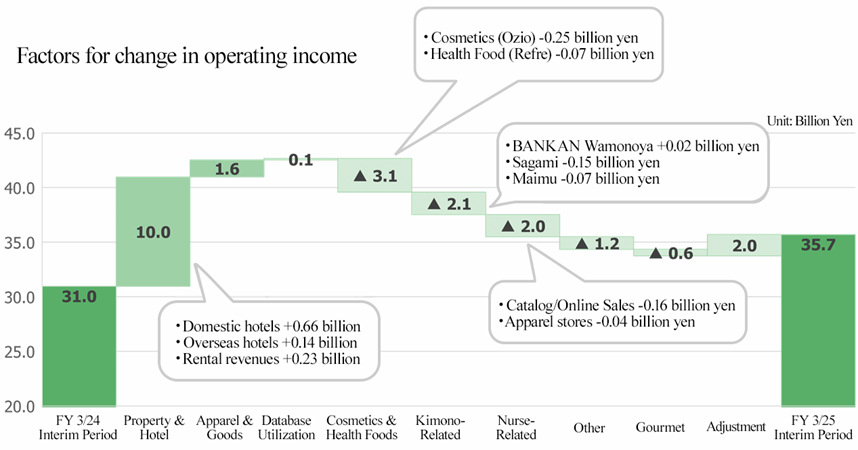 - In the first half of the fiscal year, sales grew and operating income rose by double digits as the Property Business kept contributing. The progress rate of operating income in the Property Business toward the full-year forecast reached 87.6%, and the operating income is expected to exceed the full-year forecast significantly, as there are still many foreign visitors to Japan. The sales of the Property Business accounted for 17.3% of total sales in the first half (15.5% in the first half of the previous fiscal year). As the ratio of sales of the Property Business with a high profit margin increases, it contributes to profit further, so this business is expected to contribute to the medium-term profit growth trend. The Database Utilization Business, which also has a high profit margin, is projected to see decreases in sales and profit in the fiscal year ending March 2025. On the other hand, the loss in the business of Apparel & Goods augmented in the first half, which is an issue. In the second half of the fiscal year, the sales of heavy clothes will increase and there will be some profit, but it is forecast to be not enough to cover the loss in the first half. They hope to make this business profitable, by increasing new customers and streamlining business operations. In addition, the business of Cosmetics and Health Foods saw decreases in sales and profit in the first half of the current fiscal year, showing another issue to be addressed.