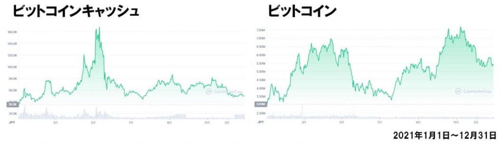 また、仮想通貨バブル期と言われる2020年後半~2021年にかけては、BCHよりもBTC・ETHの方が上昇傾向を見せています。