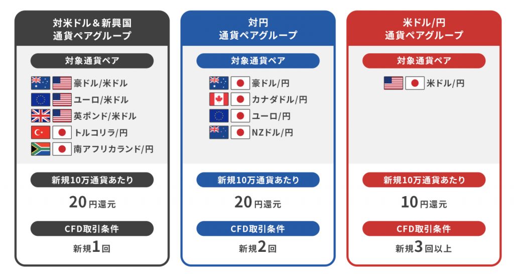 新規口座開設者に対し、口座開設完了月の翌々月の最終営業日ニューヨーククローズまでに下記の取引条件を達成すると、最大100,000円がキャッシュバックされます。